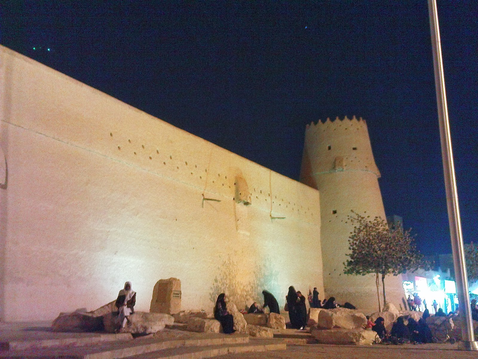 Ce soir, j'ai rendez-vous avec Helal et un de ses collègues, réceptionniste de l'hôtel parfaitement anglophone, pour aller visiter le fort Musmak qui abrite le musée de la ville. Le fort se situe au cœur de la vieille ville, et sur la place qui lui fait face les familles saoudiennes sont de sortie. Des enfants ont enfourché leur vélo et se faufilent entre les passants, sous la surveillance de leurs parents.